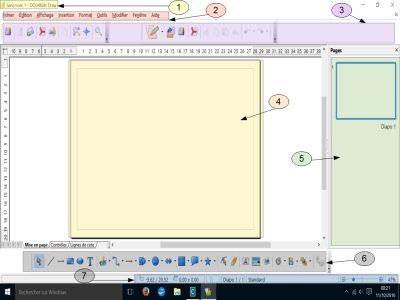 1- Nom du projet ouvert 2- Barre de menu général (menus déroulants) 3- Barre d'outils standard (pouvant être déplacée et personnalisable) 4- Espace de travail de la page en cours 5- Liste des pages crées (volet pouvant être masqué avec la petite croix de fermeture) 6- Barre d'outils de dessin 7- les onglets permettant de changer de vue et le zoom de l'affichage de la page.
